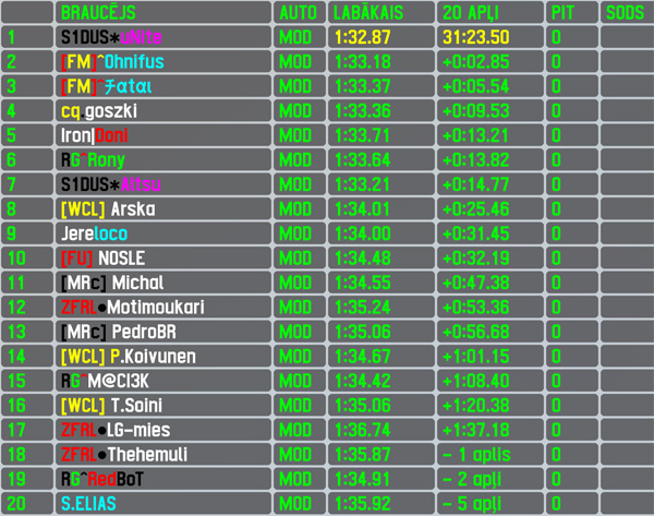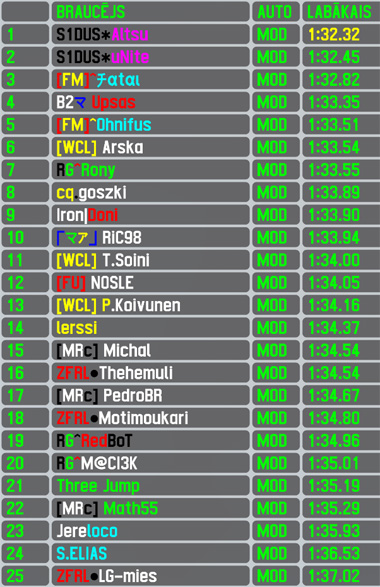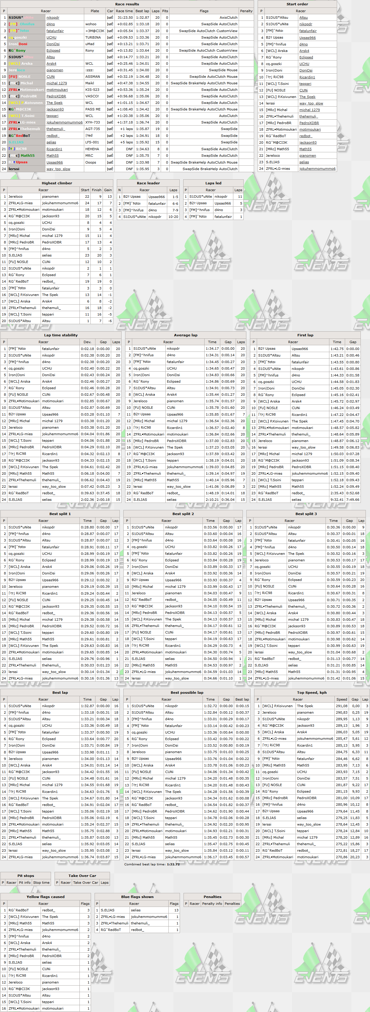 The 3-time racewinner Altsu scored his 7th pole position in his return after longer break,but lost lead before entering 1st turn and further mishaps put him down the order,later recovering himself up to 7th position in finish. Unite took over race lead in lap 10 and kept it until finish line to become 8th driver with 10 or more race wins,scoring his 22nd fastest lap of the race on the way,it was also his 59th top5 finish,breaking his tie for 3rd most of these. Ohnifus led 3 laps before being passed by race winner,but kept at least 2nd place in results,which is 2 positions better than his only other top5 finish,also his 5th place in qualifying was improvement over previous best,but just by a single position. Current 10 race rating leader Fatal also led a lap in this race,but finished in 3rd position,scoring his 13h top5 finish,Goszki broke into top5 for the first time in this event series,previous only other finish was 8th position. Doni closed the top5 and scored his 12th top5 finish.