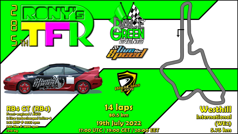 During the 11.5 years and 284 races RTFR never hosted an RB4 race in a standard configuration of Westhill - until this week. And as always it pushed the LFS's tyres to it's limits,as RB4 is well known to be heavy on the rubber,especially in such relativelly high speed road course Westhill International is. With 27 drivers this was the 2nd most attended race using RB4 in RTFR history - first being the 1st ever broadcasted RTFR race at the start of previous year,which featured the round number of 40 drivers attending,one less standing on grid though.