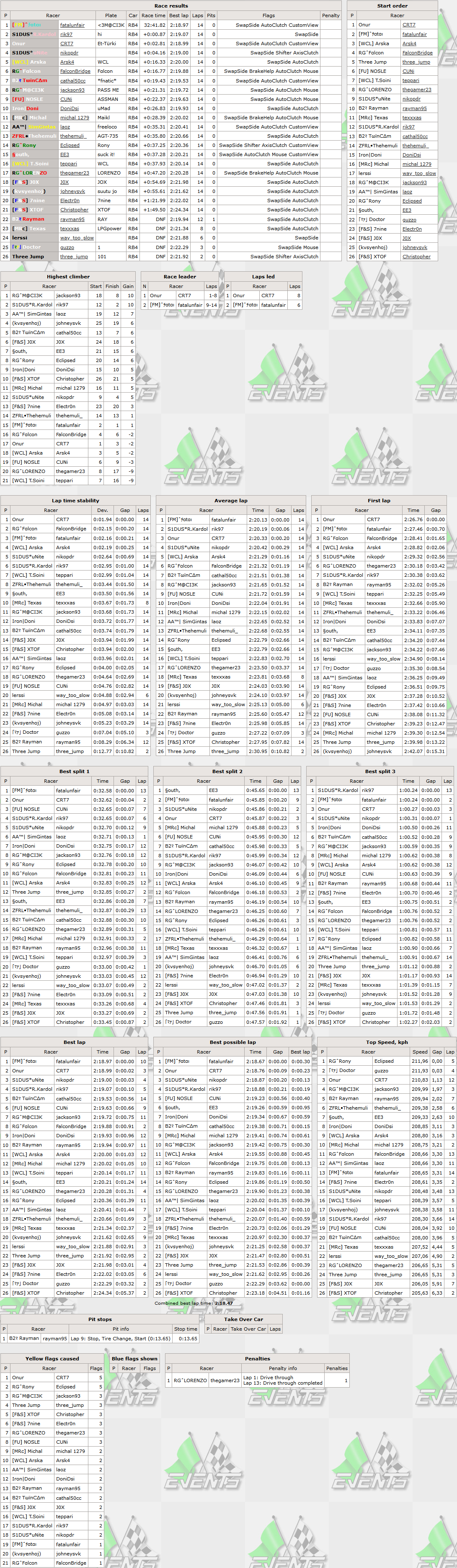 §outh, - receives 45 seconds penalty added to his finish time for multiple incidents and multiple track limits violations. Future misconducts will lead to disqualification or even race ban.