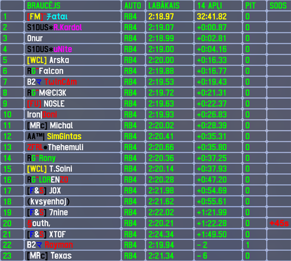 4 events or 8 weeks ago Fragmasters representative Fatal celebrated his 1st ever RTFR race win,this week he doubled the amount of these - he was the 2nd driver to beat the 2:18 laptime mark in qualifying,catched the early leader soon after half way mark and set the fastest lap on the race on the 1st lap he led fully to score also his 2nd fastest lap of the race,this win was also the 14th top5 finish for the current 10 race rating leader. The 5th most successful driver in RTFR history R.Kardol returned after 4 events break and rallied up to 2nd position starting from 6th row,scoring his 59th top5 finish. In the qualifying Onur scored his own and also his country's 1st ever pole position in RTFR with his 15th try,but could lead 8 laps in the race before losing lead,later losing another position to finish just 3rd,still that's his 4th top5 finish. Unite rounded up his top5 count to 60 by finishing 4th in this race,but another finn Arska closed the top5 scoring his 18th top5 finish.