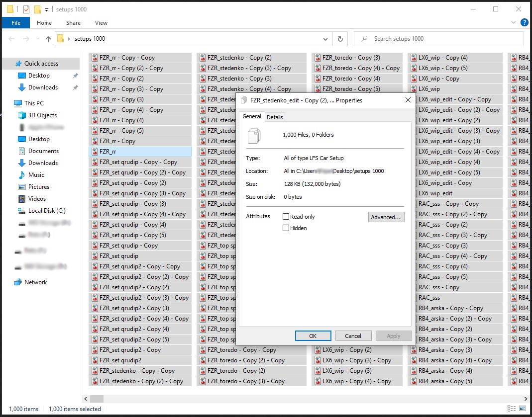 What if you are some kind master guru lfs nerd setup maker and 1000 is not enough for you? I do not know about u, keep 1000 good ones. in my 10+years of playing lfs I probably maxed out on 300sets if I sum up all useless sets as well, so I think 1000 is good number to keep them reasonable. even now my setups folder can use some cleaning and it contains only 138 set. this matter should be discussed, how it will be handled, what happens to sets more than 1000.