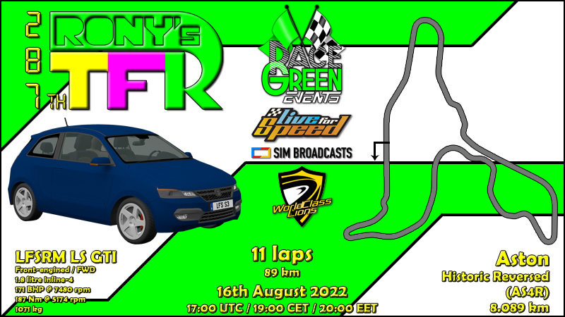 The 2nd points scoring season of this year was opened with with the 1st mod that's not based on a real car - for the 1st time RTFR was run using a community member's created fantasy car,that is something between STD and TBO classes well known by LFS users. Also the track was something never used before in RTFR - Aston's fastest long configuration Historic in reversed direction. So after close to 300 races during over 11 years we still can find plenty of firsts. Unfortunatelly the attendance reached also a record - with 21 qualifyers (19 starters) this was the lowest attendance in a livestreamed normal RTFR race (the 66th RTFR XL in june this year had 3 starters less on grid). But again - the slightly lower numbers did not bring any boredom for the racing action!