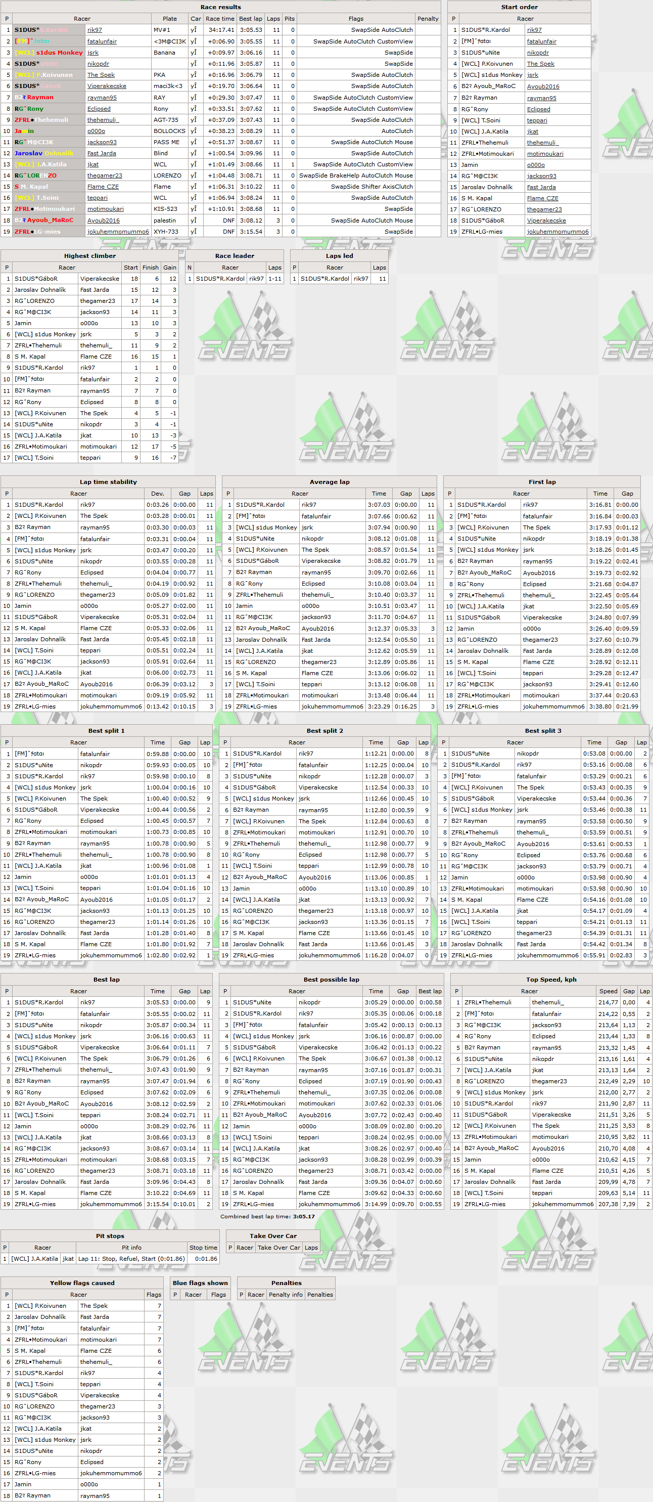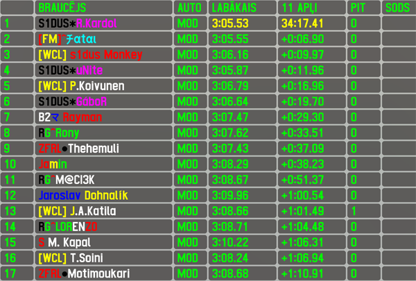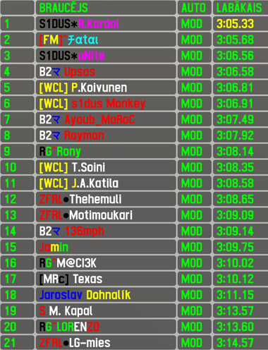 The 2021 standings winner R.Kardol reduced his activity in past couple of months,but yesterday he came back to the victory lane again after 13 events featuring other drivers - after a little 1st lap struggle for the lead,the dutchman pulled away from competition during the remaining 10 laps and scored his 13th RTFR race win,breaking the tie for 3rd most wins he had with A.Wiśniewski. He also scored his 11th pole position,10th fastest lap of the race and 60th top5 finish from 80 race starts. The 2nd front row starter Fatal was the one who tried to challenge the winner,but after own mistake he lost the grip on lead and had to go through few battles before returning to 2nd position,which he kept until end of the race - that's his 15th top5 finish from 30 total finishes. The World Class Monkey finished 3rd,also scoring the 15th top5 finish,relativelly closely followed by Unite in 4th position - that's his 62nd top5 finish,just 3 less than all time 2nd most,set by Botsi. P.Koivunen finished 5th to make 4 finns in top5,that's his 2nd top5 finish in row,3rd in total.